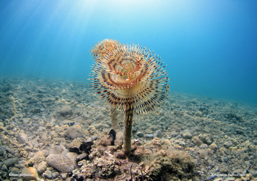 Latinski naziv: Sabella spallanzanii, Viviani, 1805. Uobičajeni naziv: Mediterranean fanworm, feather duster worm, European fan worm, the pencil worm Ostali nazivi: morski cvijet, perjaničar, kožasti cjevaš, mediteranska lepeza, crv perjanica, europska lepeza, crv olovka Dubina obitavanja: 1 – 50 m Karakteristike: Kožasti perjaničar živi u dugoj kožastoj cijevi pričvršćenoj za morsko dno. Cijev može biti dugačka i do 40 cm. Iz cijevi pruža svoja škržna pera postavljena u obliku spirale. Promjer škrga dostiže i 15 cm. Boja ticala promjenjiva je, ali obično su obrubljena narančastom, ljubičastom i bijelom bojom ili mogu biti jednolično blijedosiva. Rasprostranjenost: istočni Atlantik, Sredozemno i Jadransko more (kao invazivna vrsta zabilježen je u Brazilu i Australiji) Zanimljivosti: Ovo je jedan od najvećih crva u obitelji Sabella koji svojom ljepotom uvijek privlači pažnju ronilaca. Mnogočetinaši pretežito su morski organizmi koji pripadaju u kolutićavce. Obitavaju ispod kamenja, u mulju, među algama. Mogu biti vrlo šareni i dugi. Imaju krute, pješčane cjevčice koje strše iz pijeska, formirane od stvrdnute sluzi koju izlučuje crv i dvoslojnu krunu škržnih ticala za hranjenje koja se mogu uvući u cijev. Razni epifitski organizmi naseljavaju se i rastu na cjevčicama koje mogu biti prilično naborane u blizini svojih baza. Europska lepeza filtrator je morske vode i hrani se bakterijama, zooplanktonom, fitoplanktonom i otopljenim česticama organske tvari. Pojedinačni crvi muški su ili ženski i oslobađaju gamete u more. Velika ženka može proizvesti više od 50.000 jajašaca tijekom sezone parenja. Ličinke su planktonske i spuštaju se na morsko dno nakon otprilike dva tjedna, a metamorfoza se odvija sljedećih desetak dana.