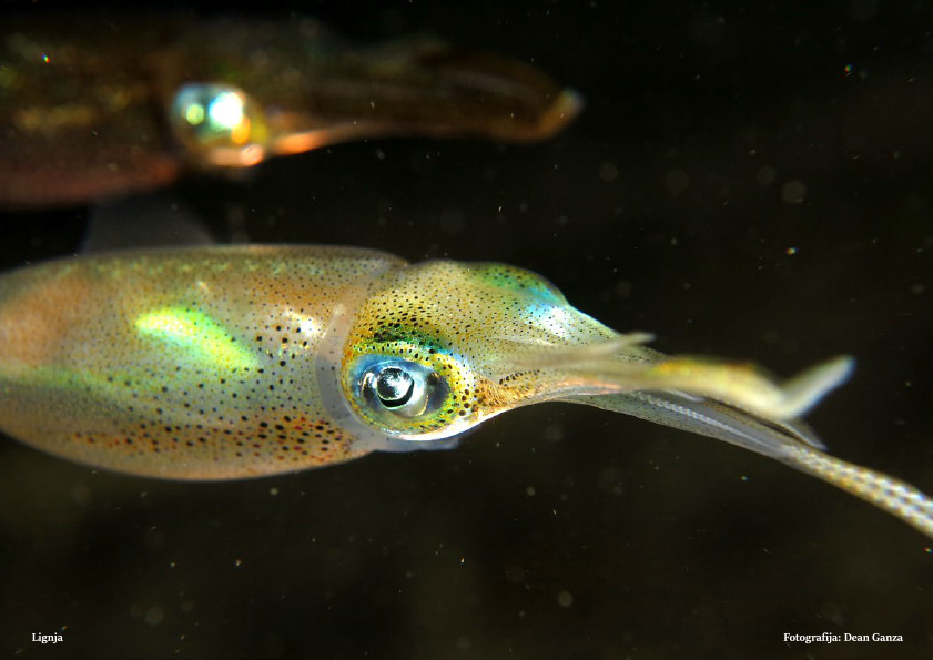 Latinski naziv: Loligo vulgaris (Lamarck, 1798) Uobičajeni naziv: European squid, common squid Ostali nazivi: Dubina obitavanja: 0 – 400 m Karakteristike: Ima razmjerno veliku glavu i 8 krakova koji imaju po dva reda pipaka te 2 lovna kraka. Unutar glave po sredini nalazi se snažan kljun nalik kljunu papige kojim drobi i usitnjava svoj plijen. Tijelo je vretenasto i duguljasto s dvije bočne peraje. Tijelo je prekriveno brojnim kromatoforima koji imaju zadaću brze promjene boje tijela (smećkaste, crvene, dok su u mužjaka u prednjem dijelu plašta vidljive crne točkice ili crtice) Rasprostranjenost: istočni Atlantik od Sjevernoga mora do Gvinejskog zaljeva, Sredozemno i Jadransko more Zanimljivosti: Kreću se jako brzo na mlazni pogon. Lignja je brzi predator koji lovi lovnim kracima koje ispaljuje velikom brzinom, a pipci na kracima omogućavaju da sigurnije zgrabi plijen i prinese ga ustima s oštrim kljunom. Dok je mala, lignja se hrani planktonom i sitnijim organizmima, a kad naraste jede i veću ribu, rakove, pa čak i svoje srodnike jer je prisutan kanibalizam. Ne ustručava se napasti ni veći plijen od sebe same. Zahvaljujući mlaznom pogonu vrlo je brza i pokretna. Smatra se da lovi i da se hrani noću jer ima vrlo razvijene oči prekrivene opnom koja je osjetljiva na vibracije. Osim obrambene namjene, gdje se boja mijenja u svrhu kamuflaže, stanice kromatofora služe i za primitivni oblik komunikacije za vrijeme mrijesta. Razmnožavanje je najintenzivnije krajem ljeta i početkom jeseni. Tada potroše potpuno gonade i ubrzo umiru. Ženka u pravilu izleže oko 6.000 jajašaca koje objesi u obliku želatinoznih vrpci na pogodne čvrste objekte. Nakon dvadesetak dana izlegu se malene lignje koje žive u planktonu nekoliko dana. Omiljeni su plijen dupina, morskih pasa i drugih većih riba.