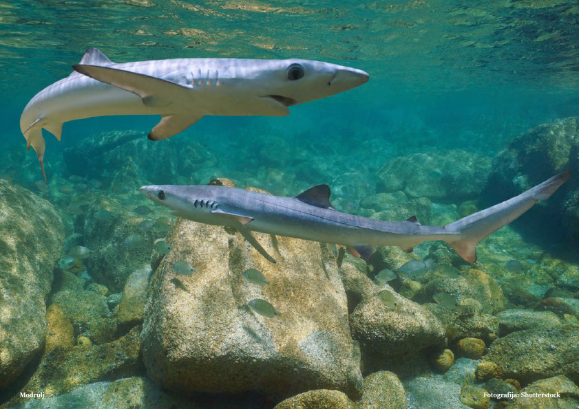 Latinski naziv: Prionace glauca, Cantor, 1849 Uobičajeni naziv: blue shark, great blue shark Ostali nazivi: Dubina obitavanja: 0 – 150 m Karakteristike: Imaju vitko, izduženo tijelo, duge prsne peraje, leđa su im tamnoplava, svjetlija po boku, a donja je strana bijela. Mužjaci obično narastu do 1,82 do 2,82 m u zrelosti, dok veće ženke obično narastu do 2,2 do 3,3 m Rasprostranjenost: kozmopolit u umjerenim i toplim morima, Sredozemno i Jadransko more. Zanimljivosti: Modrulj je jedan od najbržih morskih pasa i može uloviti i tune. Plavi morski pas ima jedinstveno osjetilo mirisa. Lignje su mu najvažniji plijen, ali njihova prehrana uključuje i druge beskralježnjake, kao što su sipe, hobotnice, jastoge, škampe, rakove, veliki broj riba koštunjača, male morske pse, strvine sisavaca i povremeno morske ptice. Modrulji se udružuju "čopor" kako bi skupili plijen u koncentriranu skupinu iz koje se lako mogu hraniti. Mogu uloviti i tunu jer plivaju velikom brzinom, što im omogućuje lako sustizanje plijena. Njegovi trokutasti zubi omogućuju mu da lako uhvati skliski plijen. Viviparni su, s placentom u obliku žumanjčane vreće te rađaju 4 do 135 mladunaca po leglu. Razdoblje trudnoće im traje između 9 i 12 mjeseci. Ženke sazrijevaju s pet do šest godina, a mužjaci s četiri do pet godina. Vjeruje se da udvaranje uključuje ugriz mužjaka jer se zrelim primjercima može točno odrediti spol prema prisutnosti ili odsutnosti ožiljaka od ugriza. Ženke modrulja prilagodile su se ovom rigoroznom ritualu parenja razvivši kožu tri puta deblju od kože mužjaka. Vrsta s obzirom na zaštitu ima status gotovo ugrožena.