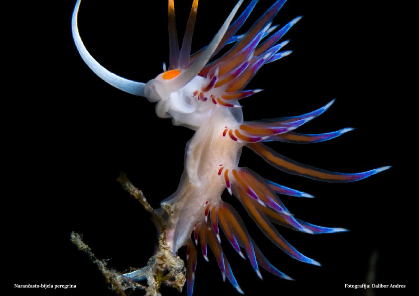 Latinski naziv: Cratena peregrina (Gmelin, 1791) Uobičajeni naziv: pilgrim hervia Ostali nazivi: bijela peregrina, bijeli hodočasnik Dubina obitavanja: 10 – 50 m Karakteristike: Tijelo puža mliječnobijele je boje. Rinofori su kraći od dugačkih šiljastih ticala. Vrh rinofora narančaste je boje. Između rinofora i ticala vidljive su dvije narančaste mrlje. Na leđima ima 8 do 10 nakupina dugačkih izraslina (cerata) koja su od vrha leđa prema bokovima sve kraća. Cerata su na površini prozirne, a u njima su vidljivi ogranci probavne žlijezde koja je narančasto-smeđe boje, no prema vrhu prelaze u ljubičastu ili plavu boju, a sam vrh cerata je bijelkast. Obično narastu do 3 cm, najviše 5 cm. Rasprostranjenost: Istočni Atlantik, na obalama Portugala, Španjolske i Senegala, Kanarski otoci, Sredozemno i Jadransko more. Zanimljivosti: Svojim jarkim bojama signalizira neprijateljima da nije jestiv. Ovaj morski puž golać tankoga i vitkoga tijela na leđima ima cerate koje djeluju poput škrga, a svaka sadrži završni izdanak probavne žlijezde hepatopankreasa. Glava ima par svijetlonarančastih rinofora i dva bjelkasta dugačka bukalna ticala koja izgledaju poput rogova. Hrani se obrubnjakom roda Eudendrium koji spada u žarnjake i uvijek ga pronalazimo u njegovoj blizini. Preferira hidroide koji su zarobili plankton jer tako guta zajedno u sendviču i plankton i hidroidni polip. Iako koristi hidroide za hvatanje plijena iz vodenog stupca, hidroidi čine samo dio njegove prehrane, a plankton čini najmanje polovicu. Žarne stanice hidroida koje tako pojede može sačuvati i pohraniti ih u vrhovima cerata, a služe mu za obranu. Peregrine su dvospolci i imaju čudnovato ponašanje pri parenju u kojem obje jedinke pokreću spolovilo jedna prema drugoj kako bi navele jednu da se ponaša kao mužjak, a drugu kao ženka. Pobjednik koji probija stjenku tijela dominantni je mužjak. Jaja se zatim polažu na podlogu gdje se razvijaju i izlegu u ličinke i dalje rastu kao odrasle jedinke.