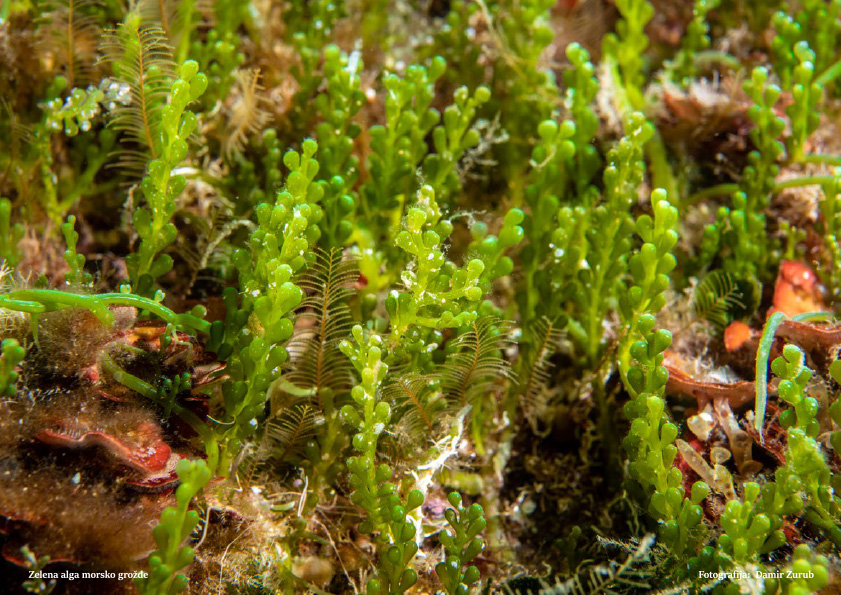 Latinski naziv: Caulerpa racemosa (Forsskål) J.Agardh, 1873. Uobičajeni naziv: sea grapes Ostali nazivi: grozdasta Caulerpa Dubina obitavanja: 2 – 60 m Karakteristike: Zelena alga s dugim stabalcem iz kojeg se šire listići i korjenčići. Na listićima morskog grožđa vidljivi su isperci u obliku malih bobica. Ova puzajuća alga stvara gustu mrežu na morskom dnu prerastajući sve ostale nepokretne organizme. Mogu narasti do visine od 30 cm. Rasprostranjenost: Zapadni dio Atlantskoga oceana od Floride do Brazila, Karibi, Kanarski otoci, Indijski ocean, Crveno more, Sredozemno i Jadransko more Zanimljivosti: Caulerpa racemosa invazivna je vrsta u Jadranu i Sredozemlju! Morsko grožđe ima niz grana povezanih sa stolonima koji su rizoidima pričvršćeni za pješčanu podlogu. Svaka jedinka sastoji se od samo jedne goleme stanice s velikim brojem jezgri. U Jadranu njen rast počinje u travnju kada se razviju novi stoloni i rastu uspravne grane, a nastavlja se do prosinca kada grane otpadnu i alge postaju uspavane. Razmnožava se najčešće vegetativno fragmentacijom. Mali odlomljeni komadići tkiva brzo se razviju u nove biljke. Razmnožava se i spolno i tada se cijeli organizam potroši u stvaranju gameta koje se oslobađaju u vodeni stupac u masovnom mrijestu otprilike 14 minuta prije izlaska sunca. Zbog ovoga gustoga zelenog oblaka, vidljivost pod morem može biti jako smanjena. Vrste iz ovog roda sadrže citotoksični kaulerpenin koji odvraća životinje od njihovog konzumiranja. Ipak, jedu ih ribe poput bukve i salpe te hridinasti ježinci. No, one rastu toliko brzo da ove vrste ne mogu kontrolirati njihovo širenje, a na mjestu svojih bujnih livada smanjuju bioraznolikost zajednice.